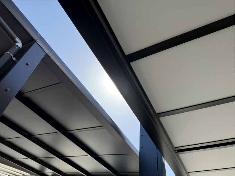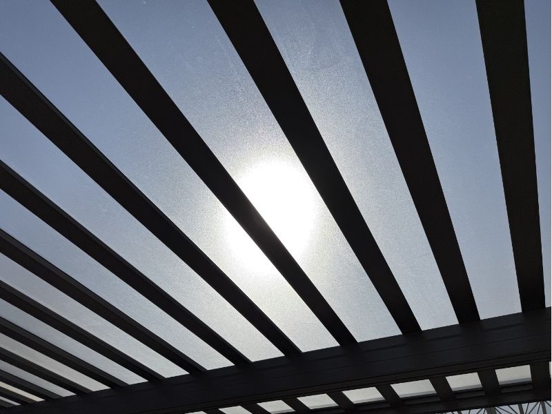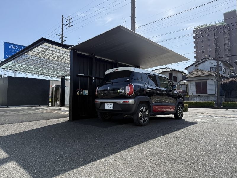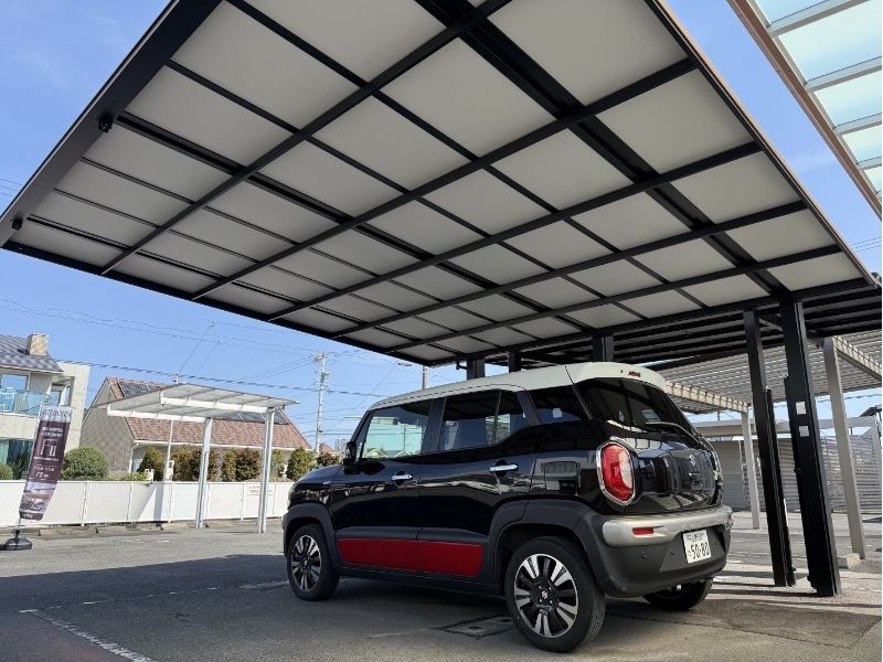 実際に屋根の下に車を止めてみましたが、色の印象なのか、ブラックポリカよりも(透過性はないが)屋根の下にいても圧迫感や暗すぎる感覚は意外と少なかったです。屋根の下が真っ暗にならないか不安という方は、シルバーポリカで印象を変えてみるのも良いかもしれません。