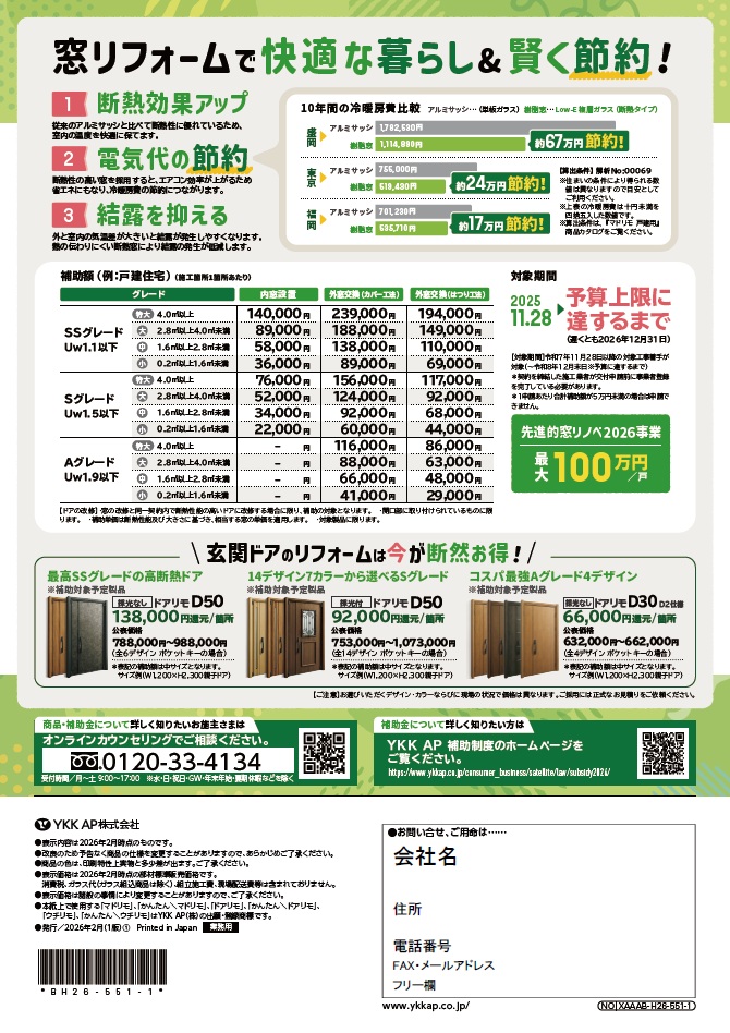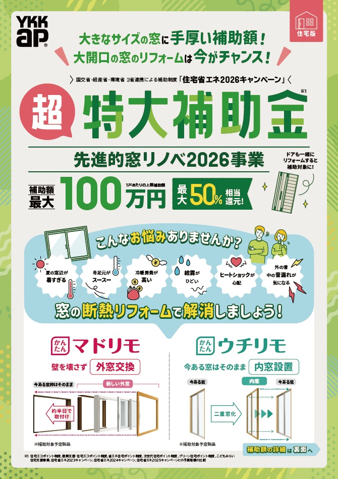 国の「先進的窓リノベ2026事業」というキャンペーンを活用すると、お得に窓のリフォームができます。